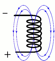 Le solénoïde, ici représenté en noir, alimenté par un courant alternatif crée un champ magnétique (en bleu sur le schéma). On constate que, à l’intérieur du solénoïde les lignes de champs sont parallèles à son axe. On peut les mettre en évidence en approchant le solénoïde (ou un aimant) d’une poudre de fer. Le sens de ces lignes dépend du sens du courant.