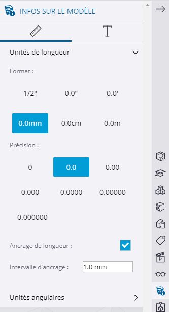 • En suivant les instructions de l'enseignant sur vos écrans, vous allez mettre Sketchup en mode millimétrique, avec une précision d'une décimale, et un intervalle d'accrochage" de 1.0mm : cliquez  dans la colonne d'icônes de droite et mettre