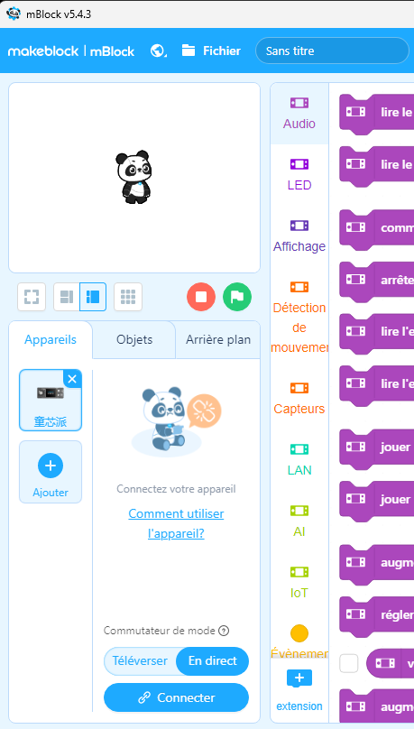 Démarrez le logiciel (ou bien ouvrez le site https://ide.mblock.cc/). Vous arrivez ici :
