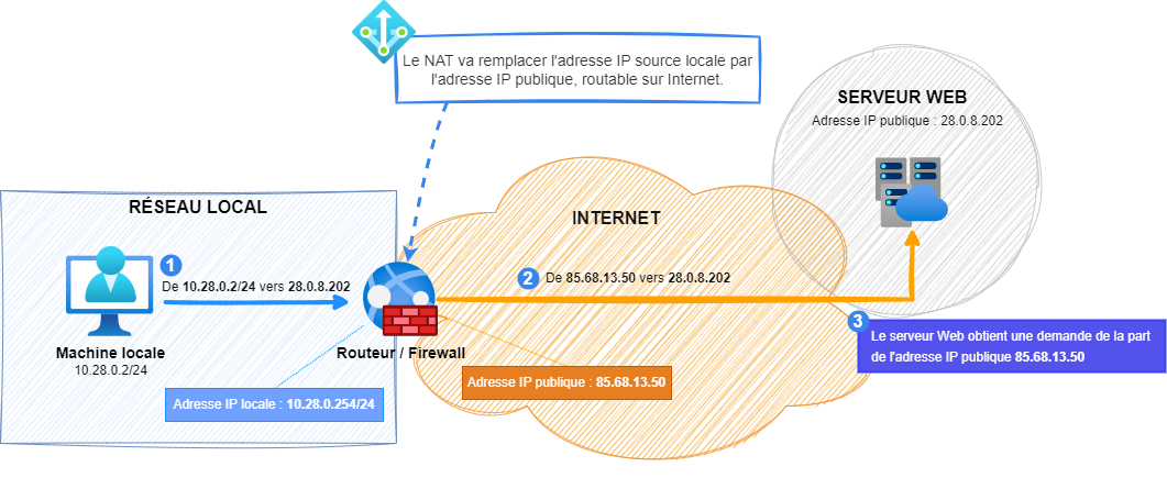 Et un schéma qui illustre les réseaux privés et publiques et la NAT : les explications sont sur la page vemotech